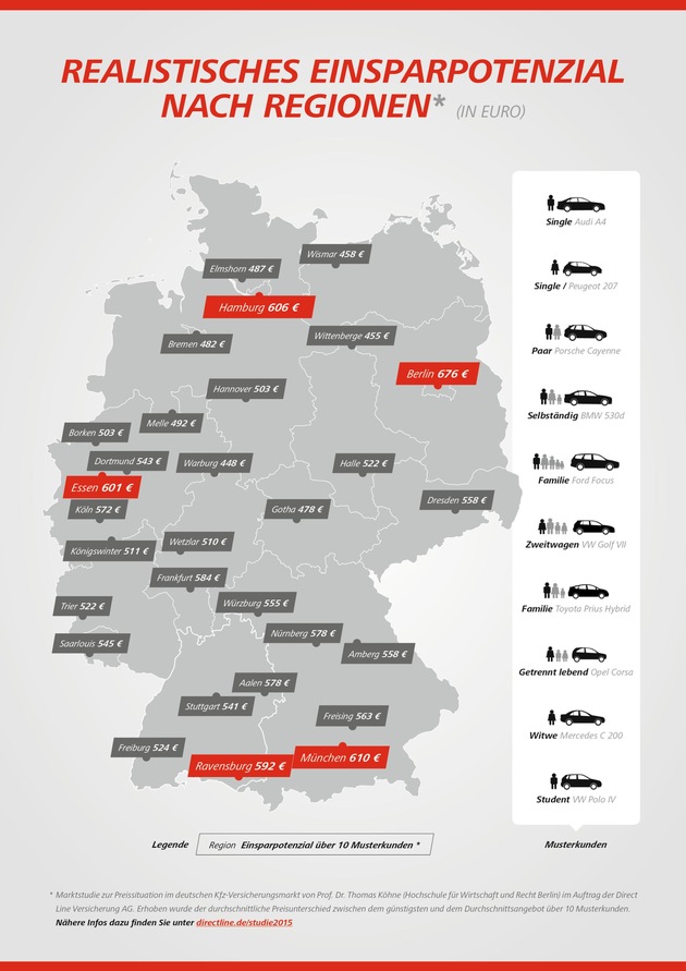 Prof. Dr. Thomas Köhne vom unabhängigen Institut für Versicherungswirtschaft an der Hochschule für Wirtschaft und Recht Berlin führte im Auftrag der Direct Line Versicherung AG bereits zum fünften Mal die "Marktstudie zur Preissituation im deutschen Kfz-Versicherungsmarkt" durch. Im Rahmen der Studie wurden deutschlandweit Angebote für zehn verschiedene Musterkunden in 30 Regionen verglichen. Dabei liegt der Abstand zwischen dem jeweils teuersten und günstigsten Angebot durchschnittlich bei 1.309 Euro. Die Preisspanne ist im Vergleich zum Vorjahr sogar um 7,7 Prozent gestiegen. Das realistische Einsparpotenzial beträgt bundesweit durchschnittlich 46,8 Prozent - ein Grund mehr für Kunden, ihre Kfz-Versicherung genau zu prüfen.