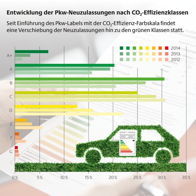 Energieeffiziente Fahrzeuge waren im Jahr 2014 die Marktführer unter den Neuzulassungen in Deutschland. Insgesamt hat die Zahl der Zulassungen nicht zuletzt dank der guten Konjunktur im Vergleich zu 2013 auf rund 3 Millionen Fahrzeuge leicht zugenommen. Fahrzeuge mit alternativen Antrieben bleiben allerdings weit hinter ihren Potenzialen zurück. Dies geht aus dem Bericht "Entwicklung der Neuzulassungen CO2-effizienter Pkws" der Deutschen Energie-Agentur (dena) hervor. Ein Grund für die gestiegene Anzahl energieeffizienter Neuwagen ist unter anderem, dass Verbraucher beim Kauf eines Neuwagens immer mehr auf Aspekte wie den Energieverbrauch und den CO2-Ausstoß achten. Diese auf einen Blick deutlich zu machen, ist Aufgabe des Pkw-Labels. Kaufinteressierte können so energieeffiziente Fahrzeugmodelle unkompliziert miteinander vergleichen.