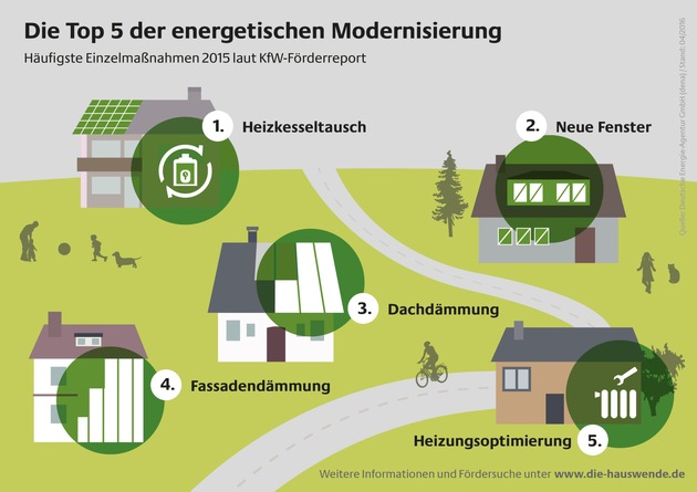 Beim Heizkostensparen gehen die meisten Hausbesitzer in Deutschland schrittweise vor: Statt gleich das ganze Haus zu sanieren, setzen viele Eigentümer auf sogenannte Einzelmaßnahmen. Der Austausch alter Heizkessel lag dabei im vergangenen Jahr erneut an der Spitze der fünf am häufigsten geförderten Modernisierungsmaßnahmen. Das zeigt eine Auswertung der aktuellen Förderstatistik der staatlichen KfW-Bank durch die Deutsche Energie-Agentur (dena). Neue Brennwertkessel, Wärmepumpen, Solarthermieanlagen, Pelletheizungen oder andere effiziente Heiztechnik unterstützte die KfW 2015 rund 63.000 Mal.
