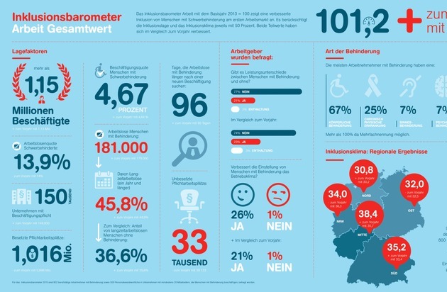 Für das Inklusionsbarometer Arbeit hat das Handelsblatt Research Institute bei einer repräsentativen Umfrage 500 mittelständische Unternehmen und 802 Mitarbeiterinnen und Mitarbeiter mit Behinderung befragt. Zugleich sind die jüngsten Zahlen aus verschiedenen Quellen wie der Bundesagentur für Arbeit in die Bewertung eingeflossen. Das Barometer setzt sich aus Teilergebnissen zur Inklusionslage und zum Inklusionsklima zusammen und wird von der Aktion Mensch 2015 zum dritten Mal erhoben.