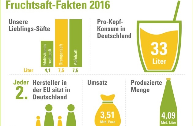 Der Pro-Kopf-Konsum liegt seit zwei Jahren stabil bei 33 Litern. Die beiden beliebtesten Sorten Apfelsaft und Orangensaft lagen dabei mit je 7,5 Litern pro Kopf 2016 in der Verbrauchergunst gleich auf. Mit deutlichem Abstand folgt Multivitaminsaft mit 4,1 Liter auf Platz zwei. Wachstum ist in einzelnen Segmenten wie Premiumsäfte, Gemüsesäfte oder auch im Bereich Smoothies zu verzeichnen. In der Verbrauchergunst steigen auch Bio-Säfte. Hier konnten sowohl Gemüsesäfte (+ 10,3 Prozent) als auch die Fruchtsaft-Direktsäfte (+ 8,7 Prozent) ihren Bio-Anteil gegenüber dem Vorjahr deutlich steigern. Eine erfreuliche Entwicklung für die Branche, die sich laufend neuen Herausforderungen stellen muss und es durch regelmäßige Produktinnovationen schafft, Fruchtsaft als natürliches Lebensmittel im Markt attraktiv zu halten.