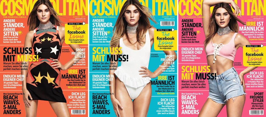 Die Aktion zeichnet sich durch die hohe Crossmedialität und den echten 360-Grad-Ansatz aus: Der digital und durch die Fans entstandene Content fließt direkt in die gedruckte COSMOPOLITAN ein. Für Chefredakteurin Anja Delastik ist diese Ausgabe etwas ganz Besonderes: "Von der Themenfindung über die Zusammenarbeit mit Facebook und den Digital-Kollegen bis hin zum Titelbild: Bei dieser Ausgabe war alles neu und aufregend. Als Highlight der August-Ausgabe gibt es die COSMOPOLITAN mit drei verschiedenen Cover-Motiven am Kiosk: Dabei präsentiert unser Titelstar Stefanie Giesinger gemäß unseres Claims 'Fun.Fearless.Female.' jedes Mal eine andere Facette." Die Leserinnen haben beim Kauf so die Möglichkeit, ihr ganz persönliches Lieblings-Motiv auszuwählen.