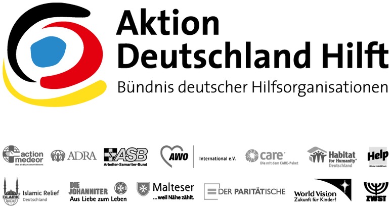 "Aktion Deutschland Hilft" ist das 2001 gegründete Bündnis von deutschen Hilfsorganisationen, die im Falle großer Katastrophen ihre Kräfte bündeln, um schnelle und effektive Hilfe zu leisten. Die beteiligten Organisationen führen ihre langjährige Erfahrung in der humanitären Hilfe zusammen, um so die bisherige erfolgreiche Arbeit weiter zu optimieren. Unter dem gemeinsamen Spendenkonto 10 20 30 bei der Bank für Sozialwirtschaft Köln ruft das vom Deutschen Zentralinstitut für soziale Fragen (DZI) geprüfte und dem Deutschen Spendenrat angehörige Bündnis zu solidarischem Handeln und Helfen im Katastrophenfall auf. www.aktion-deutschland-hilft.de