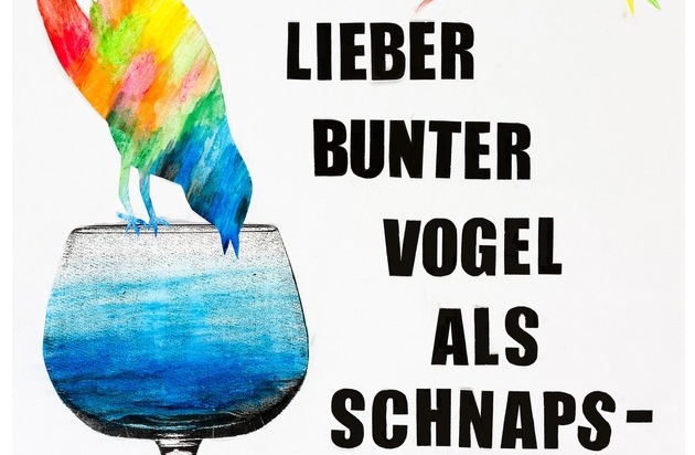 "Lieber bunter Vogel als Schnapsdrossel", steht in großen schwarzen Buchstaben auf dem Siegerbild. Bunte Vögel fliegen über einem einsamen blauen Artgenossen, der auf einem Weinglas sitzt und trinkt. "Gemeinsam bunt ist besser als einsam blau", erklären die Siegerinnen ihr erfolgreiches Plakat.