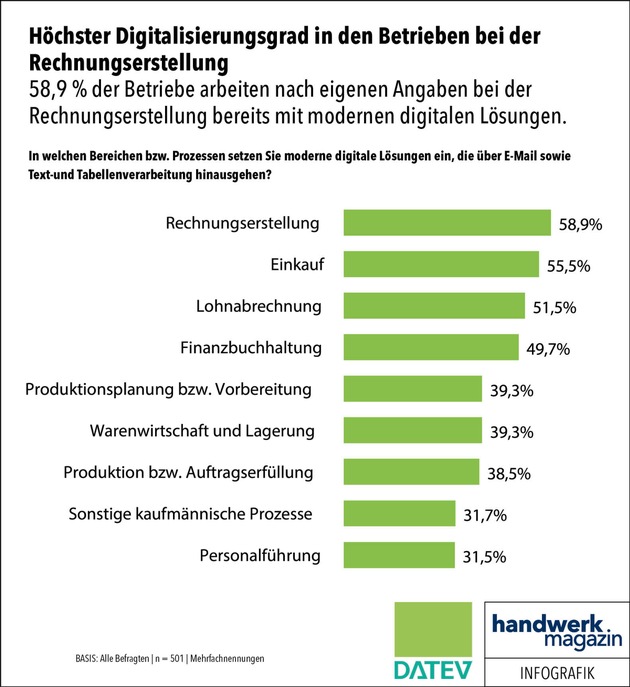 Handwerker treiben die Digitalisierung in ihren Betrieben voran. Dabei haben sie auch einen Blick auf die effizientere Gestaltung der kaufmännischen Prozesse. Das zeigt eine repräsentative Umfragestudie, die vom Institut ResearchNow im Auftrag der DATEV eG und dem handwerk magazin durchgeführt wurde. Demnach wollen fast drei Viertel der Betriebe "sicher" oder "eher ja" in den kommenden zwölf Monaten ihre kaufmännischen Prozesse effizienter gestalten. Dabei steht das Thema Rechnungserstellung bei über 52 Prozent der Handwerker in der Prioritätenliste ganz oben, obwohl hier bereits ein hoher Digitalisierungsgrad erreicht ist. Denn knapp 60 Prozent geben an, dass sie beim Erstellen von Rechnungen mit digitalen Lösungen arbeiten, die über die bloße Nutzung von E-Mail, Tabellenkalkulation und Textverarbeitung hinausgehen.