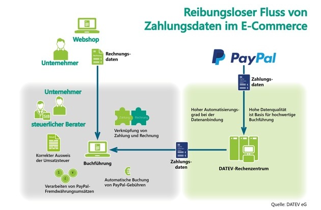 "Mit dem neuen Zahlungsdatenservice für PayPal-Daten tragen wir dieser Entwicklung Rechnung und machen die Bearbeitung sowie die steuerrechtlich als auch handelsrechtlich korrekte Abbildung von Geschäftsvorfällen aus dem E-Commerce einfacher", sagt Klaus Schröder, Mitglied der Geschäftsleitung der DATEV. Durch die automatisierte Anbindung der Datenquelle an die Buchführung entstehen große Effizienzgewinne. Zudem gewährleistet die neue PayPal-Schnittstelle eine hohe Datenqualität. "In enger Kooperation mit den DATEV-Spezialisten haben wir dafür die Aufbereitung der Daten so angepasst, dass sie unmissverständlich im Buchführungssystem verarbeitet werden können", ergänzt Frank Keller, Geschäftsführer PayPal Deutschland, Österreich und Schweiz.