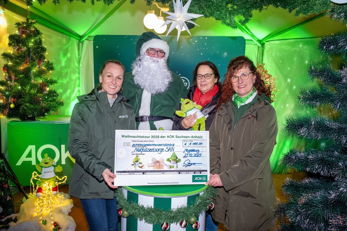 Die AOK Sachsen-Anhalt hat gestern auf dem Weihnachtsmarkt in Halle (Saale) eine Spende in Höhe von 8.150 Euro an die psychosoziale Notfallversorgung Sachsen-Anhalt übergeben. Das Geld hat die AOK in den letzten Wochen auf den Weihnachtsmärkten im Land gesammelt.
