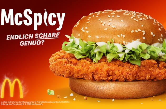 Schärfe-Fans aufgepasst! Mit der neuen Kampagne McSpicy® bringt McDonald's Deutschland ab dem 01. Oktober den spürbar scharfen McSpicy® Burger sowie weitere feurige Produktneuheiten auf den deutschen Markt - und stellt dabei die provokante Frage: "Endlich scharf genug?"