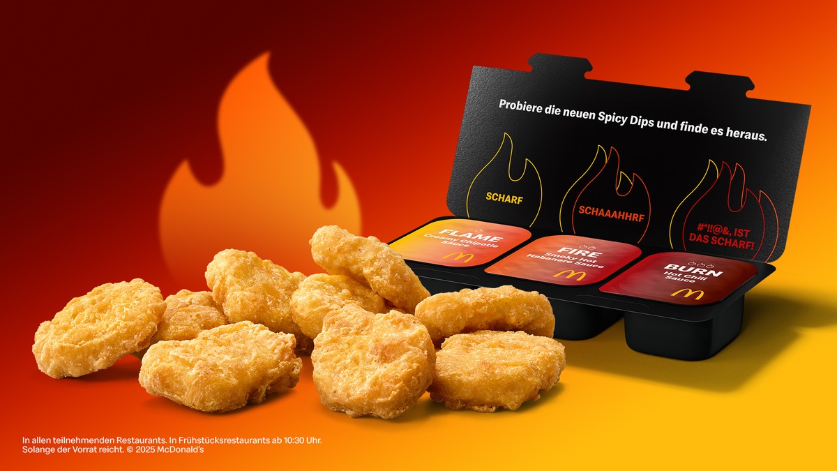 Für alle, denen es noch nicht scharf genug ist, gibt es jetzt die Spicy Dip Challenge mit dem ultimativen Spicy Dipset aus drei feurigen Saucen: die Flame Creamy Chipotle Sauce, die Fire Smoky Hot Habanero Sauce und die Burn Hot Chilli Sauce. Jede mit eigenem Schärfe-Level, eine intensiver als die andere. Im Bundle mit 9 oder 20 knusprigen Chicken McNuggets® oder McPlant® Nuggets dient das Set als perfekte Basis für den nächsten Schärfewettbewerb.