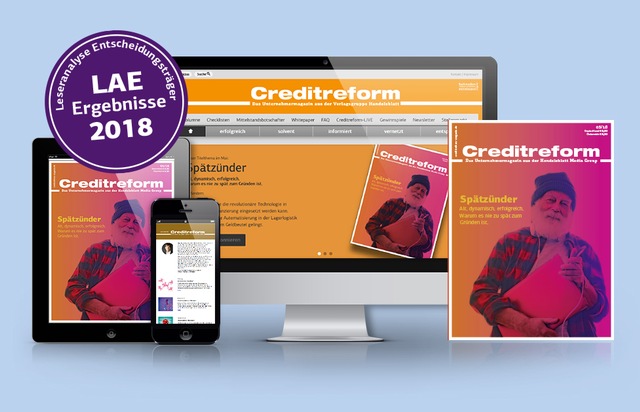 Das Unternehmermagazin Creditreform aus der Handelsblatt Media Group verzeichnet den stärksten Reichweitenzuwachs unter den Monatsmagazinen bei der Reichweitenstudie LAE 2018 - "Leseranalyse Entscheidungsträger in Wirtschaft und Verwaltung" - und beweist sich als zentraler Titel für die Mediaplanung im Mittelstand.