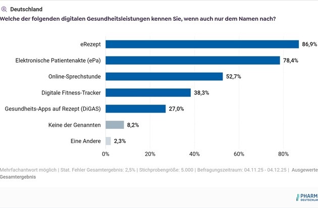 Das E-Rezept ist mit 86,9 Prozent die bekannteste und mit knapp 60 Prozent Nutzung die etablierteste digitale Anwendung im Gesundheitswesen. Allerdings ist die Zahl der E-Rezept-Nutzer im letzten halben Jahr nur leicht von 55,7 Prozent auf aktuell 59,3 Prozent gestiegen (Stand 04.12.2025). Die elektronische Patientenakte (ePA), die vor allem von sich noch in Ausbildung befinden Menschen genutzt [PE1] wird, hat die Zahl der Nutzer deutlicher steigern können. Während Anfang Juni nur 12,1 Prozent der Befragten angaben, die ePA zu nutzen, sind es Anfang Dezember immerhin 20,3 Prozent. Die Gesundheits-Apps auf Rezept (DiGAs) sind dagegen weniger als ein Drittel (27,0 Prozent) der Bürgerinnen und Bürger bekannt und werden nur von 5,4 Prozent genutzt.