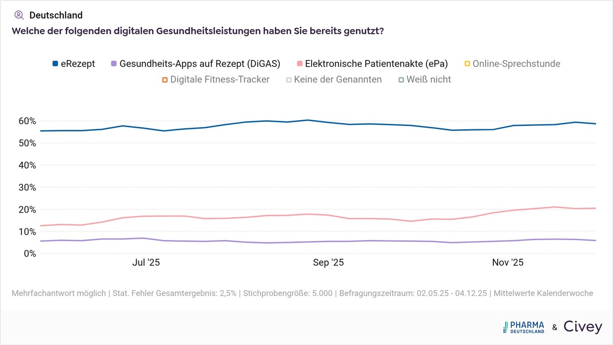 Die Digitalisierung des deutschen Gesundheitswesens kommt schwer voran. Mehr als vier Jahrenach der Einführung der Gesundheitsanwendungen auf Rezept (DiGAs), fast zwei Jahre nach der verbindlichen Einführung des E-Rezeptes und gut zehn Wochen nach dem Start der verpflichtenden Nutzung der elektronischen Patientenakte (ePA) durch Leistungserbringer, verharren die Nutzerzahlen für alle drei digitalen Gesundheitsanwendungen deutlich unter ihrem Bekanntheitsgrad. Das ist die zentrale Erkenntnis einer aktuellen Civey-Umfrage in Auftrag von Pharma Deutschland.
