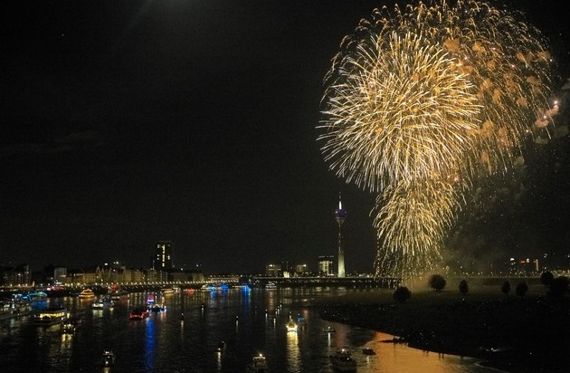 Wie die kulturellen Traditionen Japans in Form eines Feuerwerks umgesetzt werden können, bewies der japanische Feuerwerkskünstler Hideki Kubota mit seinem spektakulären Programm "Japanische Tradition - Kunst und Kultur". Am nächtlichen Himmel über dem Rhein erstrahlten neben Ikebana-Blumen auch Fächer und natürlich der spektakuläre Goldregen zum Abschluss. Der WDR hat den "Feuerzauber über Düsseldorf" live übertragen. Die Sondersendung wird auch in der WDR Mediathek verfügbar sein. Auf der Facebook-Seite Visit Düsseldorf finden sich zudem weitere Bildergalerien vom diesjährigen Fest.
