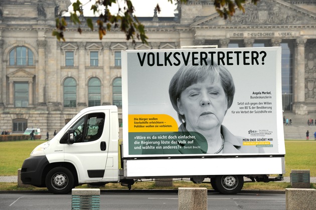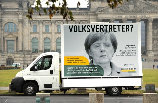 Selten war die Kluft zwischen Bevölkerung und Politik so offensichtlich wie in der Frage der Sterbehilfe. Dies verdeutlicht eine Plakataktion der Giordano-Bruno-Stiftung (gbs), die am heutigen Mittwoch in Berlin startete. Die Plakate zeigen Kanzlerin Angela Merkel, den Sterbehelfer Uwe-Christian Arnold ("Letzte Hilfe") und Dignitas-Gründer Ludwig A. Minelli mit geschlossenen Augen. Im Fall von Arnold und Minelli signalisiert das Bildmotiv, dass beide die vor einem Jahr gestartete "Kampagne für das Recht auf Letzte Hilfe" unterstützen. Im Fall von Angela Merkel zeigt es an, dass die Kanzlerin die Augen davor verschließt, dass 80 Prozent der deutschen Bevölkerung gegen die geplante Kriminalisierung professioneller Freitodbegleitungen votieren. Bürgerwille und Politik gehen in dieser Frage so weit auseinander, dass man sich an die berühmten Worte Bertolt Brechts erinnert fühlt: "Wäre es da nicht doch einfacher, die Regierung löste das Volk auf und wählte ein anderes?"