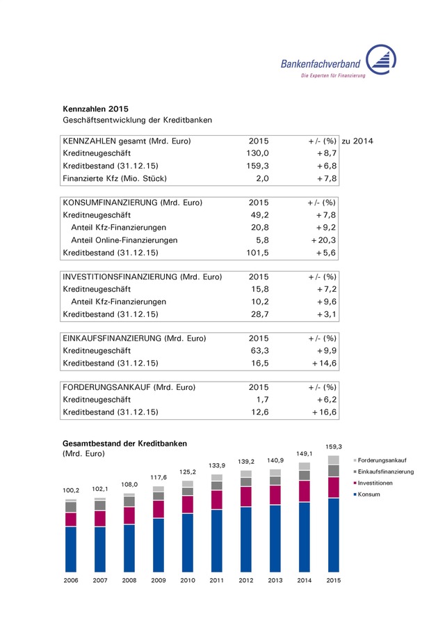 Verbraucher und Unternehmen haben im vergangenen Jahr mehr Kredite genutzt als im Vorjahr. Entsprechend konnten die auf das Kreditgeschäft spezialisierten Banken ihr Geschäft in 2015 weiter ausbauen. Dies erklärte Jan W. Wagner, Vorstandsvorsitzender des Bankenfachverbandes, heute vor Journalisten in Frankfurt. 159,3 Milliarden Euro hatten die Verbandsmitglieder Ende 2015 an Privatpersonen und Firmen verliehen. "Die Kreditbanken haben einen neuen Höchstwert erreicht und sind mit einem Bestandsplus von 6,8 Prozent so stark gewachsen wie zuletzt im Jahr der Abwrackprämie", so Wagner. Etwa die Hälfte ihres Neugeschäfts an Konsum- und Investitionskrediten entfällt auf Kraftfahrzeuge vom privaten Pkw bis zum Lieferwagen. Dieser Bereich war neben Online-Finanzierungen einer der wesentlichen Wachstumstreiber. Insgesamt konnten die Kreditbanken alle Geschäftsfelder ausbauen.