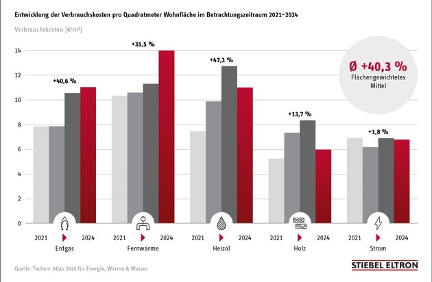 Die Verbrauchskosten für fossile Brennstoffe sind in den vergangenen Jahren dramatisch gestiegen, wie der "Techem Atlas 2025 für Energie, Wärme & Wasser" berichtet: Pro Quadratmeter Wohnfläche verteuerte sich der Preis für Erdgas von 2021 bis 2024 um insgesamt 40,6 Prozent, bei Heizöl waren es 47,3 Prozent. Der für den Antrieb einer Wärmepumpe erforderliche Strom hat sich laut der Studie mit einem Anstieg von 1,8 Prozent nur moderat verteuert.