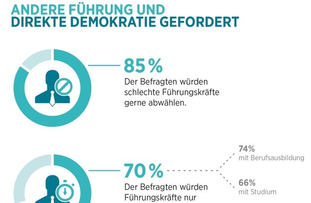 Stärker Einfluss nehmen möchten Berufstätige auch beim Thema Führung: 85 Prozent der Befragten möchten schlechte Führungskräfte gerne abwählen, 70 Prozent möchten Führungskräfte nur auf Zeit wählen. Aus gutem Grund: Vier von zehn Berufstätigen finden, dass die Führungskräfte in ihrem Unternehmen Veränderungen blockieren und neue Ideen abprallen lassen.