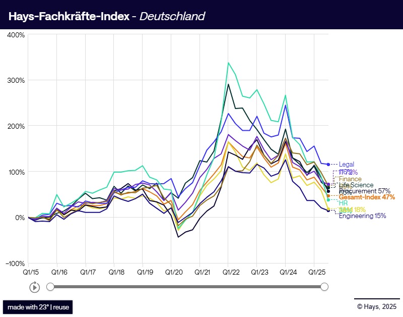 Wie bereits im vorherigen Quartal, ist die Nachfrage nach Fachkräften in Deutschland auch im dritten Quartal 2025 weiter zurückgegangen. Der Hays Fachkräfte-Index ist im Vergleich zum Vorquartal um rund 20 Prozentpunkte[1] auf 47 Prozent gesunken und verzeichnet damit den niedrigsten Stand seit Ende 2020. Damit setzt sich die verhaltene Entwicklung bei den Stellenausschreibungen aus dem ersten Halbjahr fort und bestätigt: Viele Unternehmen bleiben angesichts wirtschaftlicher Unsicherheiten bei Neueinstellungen vorsichtig.