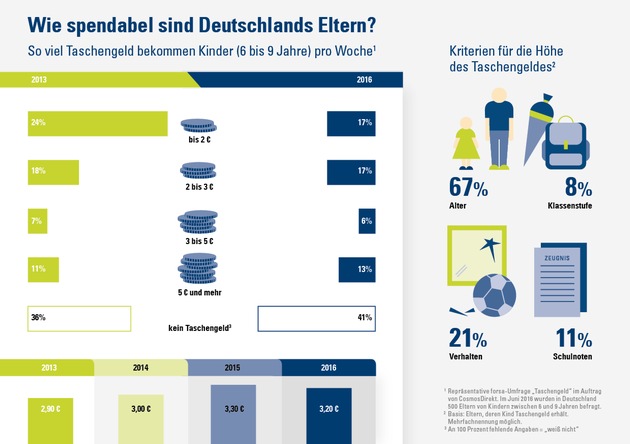 Das erste "Gehalt" gibt's von Mama und Papa: Über die Hälfte der Grundschulkinder in Deutschland bekommt Taschengeld. Wie Eltern die Höhe des Taschengeldes festlegen, wie oft und wie weit sie das Portemonnaie für den Nachwuchs öffnen, zeigt jetzt eine repräsentative forsa-Umfrage im Auftrag von CosmosDirekt.(1)