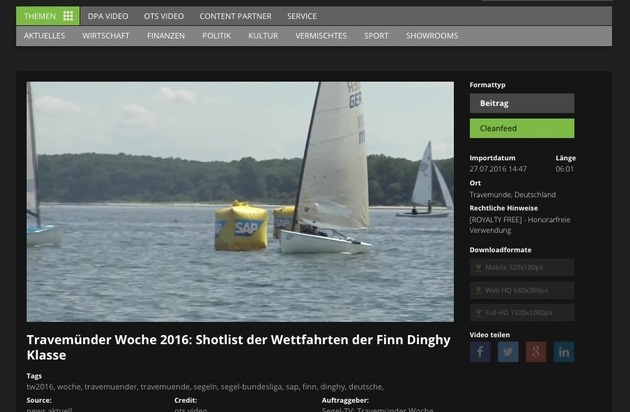 SAP, weltgrößter Anbieter von Unternehmenssoftware und Partner der Travemünder Woche setzte beispielsweise für die Dokumentation des Segel-Events auf die Services von news aktuell. Vorab wurde via ots ein Teaser-Video verbreitet, um auf die Segelregatten aufmerksam zu machen. Im Laufe des Events stellte SAP außerdem sogenannte Cleanfeeds - neutrale Schnittbilder ohne Bauchbinden - über die dpa-Video-Plattform zur Verfügung und kündigte diese via ots an.