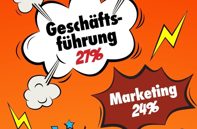 1. Geschäftsführung (27 Prozent) 2. Marketing (24 Prozent) 3. Vertrieb (15 Prozent) 4. IT (14 Prozent) 5. Finanzen (13 Prozent) 6. Recht (12 Prozent) 7. Controlling (8 Prozent) 8. Werbung (7 Prozent) 9. Kundenservice (5 Prozent) 10. Business Development (4 Prozent)