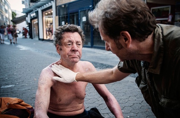 TRABERT: Das Bild zeigt eine intime zwischenmenschliche Situation zwischen Patient und Arzt im öffentlichen Raum. Um ein solches Foto authentisch machen zu können, braucht der Patient und auch der Arzt Vertrauen in den Fotografen. Gerade um nicht voyeuristisch sondern authentisch die Situation abbilden zu können. Da unser Fotograf Andreas Reeg durch die jahrelange, kontinuierliche Begleitung selbst einen persönlichen Bezug zu vielen von Wohnungslosigkeit betroffenen Menschen und auch zu mir als behandelnden Arzt aufgebaut hatte, war dieses intime, authentische Bild möglich.