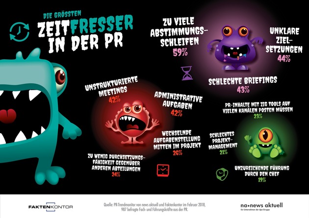 Die größten Zeitfresser in der PR (Top Ten): 1. Zu viele Abstimmungsschleifen 59% 2. Unklare Zielsetzungen 44% 3. Schlechte Briefings 43% 4. Unstrukturierte Meetings 42% 5. Administrative Aufgaben 42% 6. Wechselnde Aufgabenstellung mitten im Projekt 26% 7. Zu wenig Durchsetzungsfähigkeit gegenüber anderen Abteilungen 24% 8. PR-Inhalte mit zig Tools auf vielen Kanälen posten müssen 23% 9. Schlechtes Projektmanagement 21% 10. Unzureichende Führung durch den Chef 19%