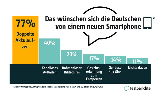 Für die repräsentative Umfrage hat Kantar EMNID im Auftrag von testberichte am 5. und 6. September 2017 insgesamt 564 Personen telefonisch gefragt, welche Eigenschaften ihnen beim Kauf eines neuen Smartphones besonders wichtig seien. Die Teilnehmer waren zwischen 14 und 60 Jahre alt und je zur Hälfte Frauen und Männer.