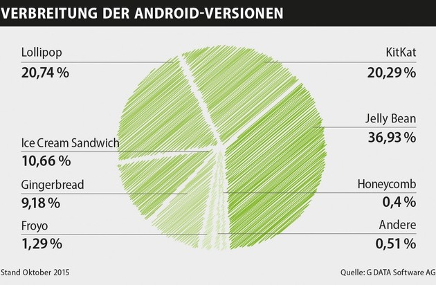 Im aktuellen Mobile Malware Report Q3/2015 haben die G DATA Sicherheitsexperten untersucht, welche Android-Versionen auf Smartphones und Tablets mit einer G DATA Sicherheitslösungen installiert ist. Über 80 Prozent nutzen veraltete Android-Versionen, die bereits bekannte Sicherheitslücken aufweisen. Lediglich rund 20 Prozent haben ein aktuelles Betriebssystem im Einsatz. Da die Statistik im Oktober 2015 erstellt wurde, fehlt das neue Android-6-Betriebssystem (Marshmallow).