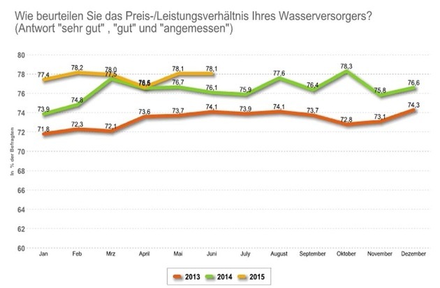 Auch das Preis-Leistungs-Verhältnis bewerten die befragten Verbraucher als ausgewogen: Mehr als drei Viertel der befragten Verbraucher halten ihren Wasserpreis für mindestens angemessen.