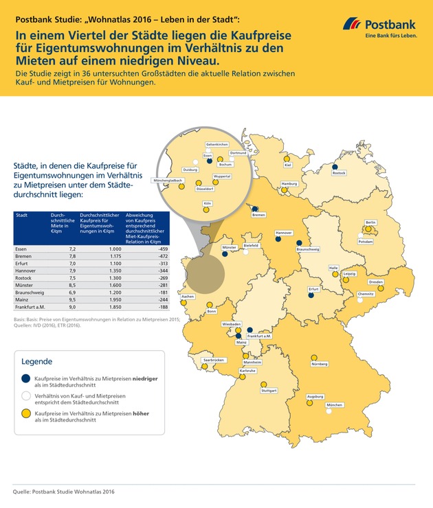 Die Postbank Studie "Wohnatlas 2016 - Leben in der Stadt" wurde unter der Leitung von Michael Bräuninger, Professor an der Helmut Schmidt Universität und Experte für Economic Trends Research, durchgeführt. Analysiert wurden die 30 größten deutschen Städte und sechs Städte, die jeweils die größten ihres Bundeslandes sind, aber nicht zu den Top 30 gehören. Im Fokus der beschriebenen Analyse steht die Entwicklung der Miet- und Kaufpreise für Eigentumswohnungen (pro m²).
