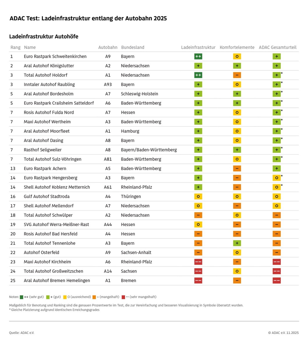 Für den ADAC Test zu Ladeinfrastruktur entlang der Autobahn wurden insgesamt 50 Rastanlagen und Autohöfe entlang der 15 längsten Autobahnen zwischen dem 5. und 16. Mai 2025 untersucht. Ziel war es, die Alltagstauglichkeit der Ladeangebote für Reisende mit Elektrofahrzeugen realitätsnah zu bewerten. Der Fokus des Tests lag auf den Kategorien „Ladeinfrastruktur“ (Anzahl, Leistung, Bezahlmöglichkeiten etc.) sowie „Komfortelemente“ (Überdachung, Gastronomie, Sanitäreinrichtungen etc.).
