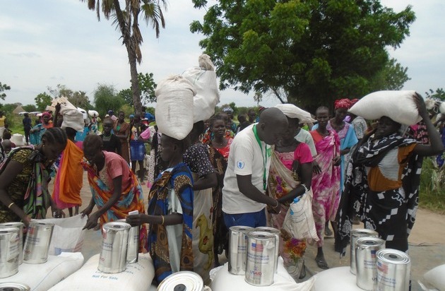 Die Welthungerhilfe verteilt auch weiterhin als eine der wenigen Hilfsorganisationen Nahrungsmittel im Norden des Landes rund um Bentiu. Jeden Monat erhalten dort knapp 200.000 Flüchtlinge dringend benötigte Lebensmittel wie Sorghum, Linsen, Öl und Salz. Besonders unterernährte Kinder erhalten eine Spezialnahrung. Laut UN-Angaben sind 250.000 Kinder akut unterernährt. "Diese Menschen würden ohne uns verhungern, denn sie sitzen in dem einzigen Lager in der Region fest. Sie können nicht in ihre Dörfer zurück, weil verschiedene bewaffnete Kämpfer die Gebiete unsicher machen. Besonders für Frauen ist es gefährlich, denn sie werden zu Opfern der unsäglichen Gewalt im Land. Das Flüchtlingslager ist überfüllt und die Bedingungen sind besonders in der Regenzeit entsetzlich", beschreibt Jonas Wiahl, der Landesdirektor der Welthungerhilfe, die Situation vor Ort.