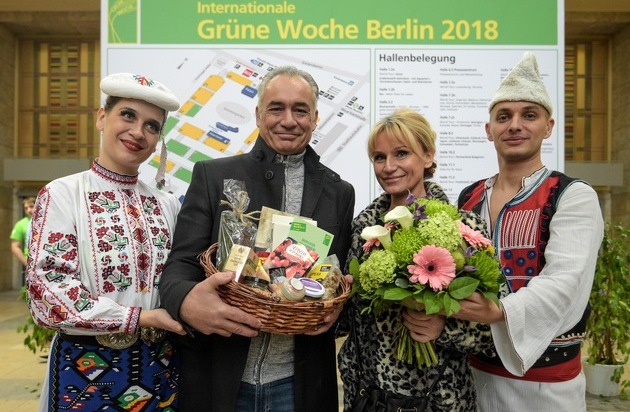 Sprachlos war die 100.000. Besucherin der Grünen Woche, als sie von ihrem Glück erfuhr. "So gar nicht", entfuhr es Christiane Moritz aus Großziethen, als sie gefragt wurde, ob sie das erwartet hätte. Im Beisein eines bulgarischen Tänzer-Duos wurde der Brandenburgerin ein Präsentkorb mit Spezialitäten des Partnerlandes Bulgarien sowie ein Blumenstrauß überreicht. Zusammen mit ihrem Freund Giuseppe Gruner hat sie geplant, die Wein- und Länderstände der Grünen Woche zu besuchen. Gutes Timing hat das Paar bewiesen, denn sie hatten zuvor eine halbe Stunde einen Parkplatz gesucht, wie Guiseppe Gruner berichtete.