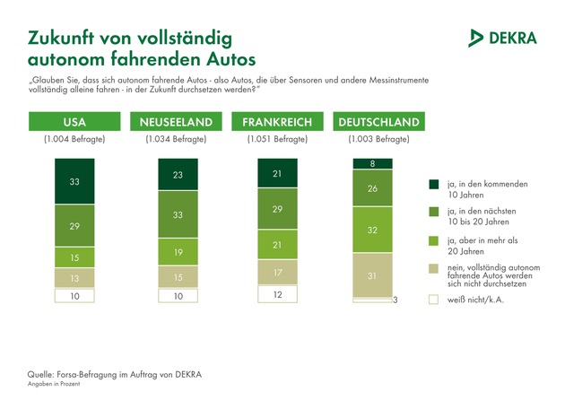 Die Deutschen sind mit Blick auf das Autonome Fahren der Zukunft spürbar skeptischer als Menschen in anderen Ländern. Das zeigt eine internationale Forsa-Befragung im Auftrag der Sachverständigenorganisation DEKRA, deren Ergebnisse auf der IAA in Frankfurt vorgestellt wurden. Demnach glauben nur 8 % der Befragten in Deutschland, dass sich vollständig autonom fahrende Autos in den kommenden zehn Jahren durchsetzen werden. 32 % rechnen damit, dass es noch mehr als 20 Jahre dauern wird, weitere 31 % glauben sogar, dass sich vollständig autonom fahrende Autos überhaupt nicht durchsetzen werden. In den anderen untersuchten Ländern Frankreich (21 %), Neuseeland (23 %) und USA (33 %) erwarten deutlich mehr Befragte den Siegeszug der autonom fahrenden Autos bis 2025.