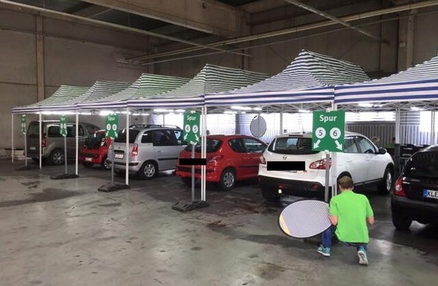 Die Standorte für die Sammelbesichtigungen sind nach folgendem Drive-in-Prinzip konzipiert: Für jeden Sachverständigen ist eine Spur eingerichtet, auf der die Kunden ihre Fahrzeuge zur Besichtigung vorführen. Pro Woche werden aktuell rund 800 Fahrzeugen bei den Sammelaktionen begutachtet.