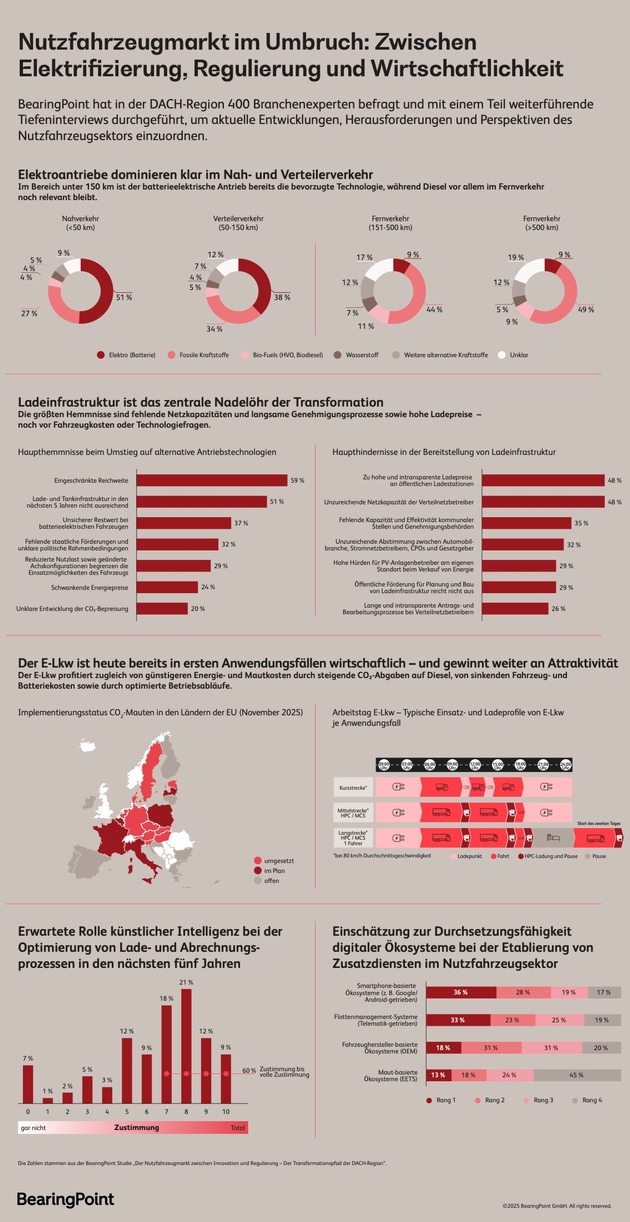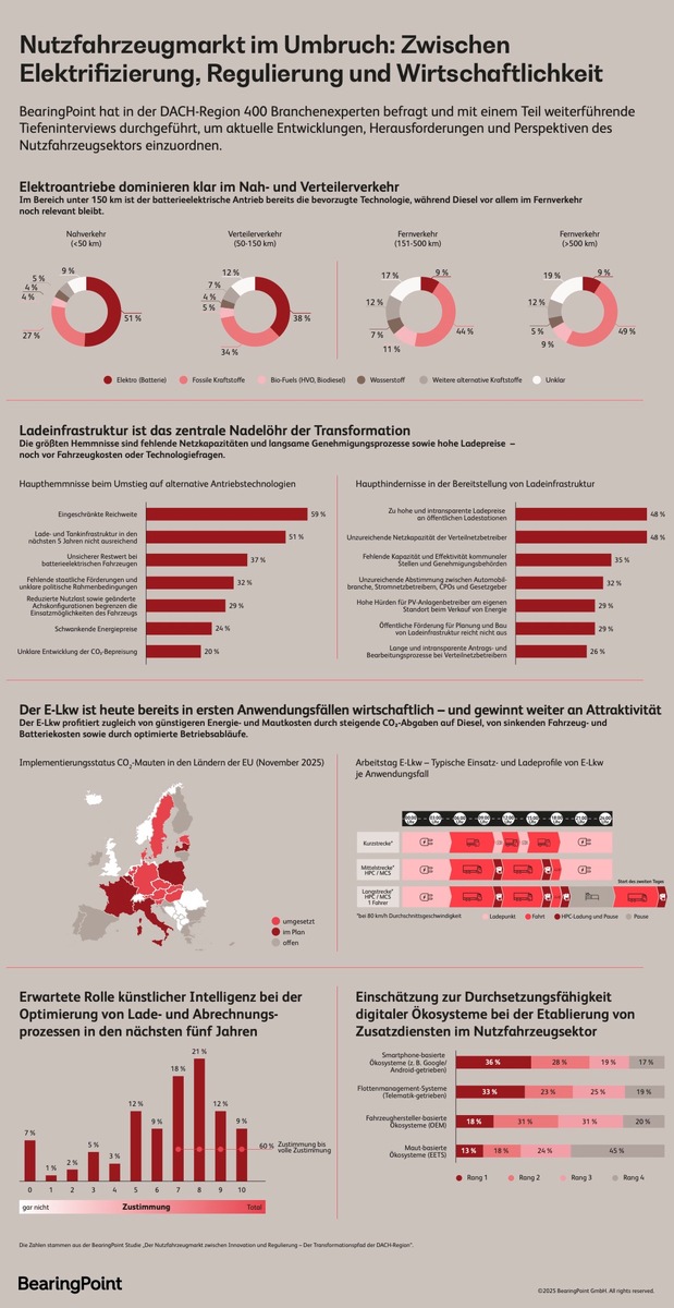 Die Logistikbranche steht am Beginn einer neuen Ära: Batterieelektrische Lkw sind technisch reif und der kommerzielle Kipppunkt ist in greifbarer Nähe. Vorreiter preschen mit innovativen Lösungen voran und investieren bereits in die Elektrifizierung ihrer Flotten. Doch der Markthochlauf wird weiterhin durch fehlende Ladeinfrastruktur, unzureichende Netzanschlüsse und langwierige Genehmigungsverfahren gebremst. Die neue Studie der Management- und Technologieberatung BearingPoint, für die 400 Expert:innen aus Flottenmanagement, OEMs, Energieversorgung, Logistik und Mineralölwirtschaft in der DACH-Region befragt wurden, zeigt: Jetzt ist Momentum da - die Regulatorik muss mit Hochdruck die Rahmenbedingungen schaffen, um die Skalierung zu ermöglichen.