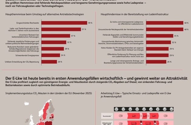 Die Studie basiert auf einer Befragung von 400 Expert:innen aus der DACH-Region, darunter Fuhrparkverantwortliche, OEMs, Energie- und Serviceprovider, Logistikunternehmen sowie Vertreter der Mineralölwirtschaft. Die Erhebung wurde zwischen April und Oktober 2025 durchgeführt und analysiert die Herausforderungen, Chancen und Handlungsfelder im Zuge der Elektrifizierung des Nutzfahrzeugsektors.