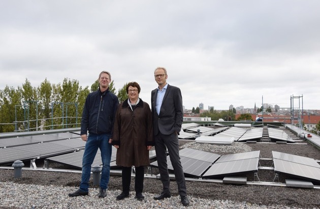 Auf dem Dach wird derzeit dafür die Photovoltaikanlage installiert: Die Anlage verfügt über eine Leistung von 83,75 Kilowatt peak und wird pro Jahr voraussichtlich knapp über 77.400 Kilowattstunden Sonnenstrom erzeugen. Durch die Ausrichtung der Module nach Osten und Westen produziert die Anlage vor allem in den Morgen- und Abendstunden Strom, orientiert sich also besser am Bedarf der durchschnittlichen Haushaltskunden als eine nach Süden ausgerichtete Anlage. Über die Hälfte des produzierten Stroms kann auf diese Weise direkt im Haus genutzt werden, die Überschussmengen werden ins öffentliche Stromnetz eingespeist. 68 Wohnungen und eine Gewerbeeinheit können so in Kürze mit einem sauberen Mix aus Sonnenstrom vom Hausdach und Ökostrom aus dem Netz versorgt werden. Dieser besteht zu knapp 30 Prozent aus hausgemachtem Strom und zu rund 70 Prozent aus Ökostrom aus dem Netz.