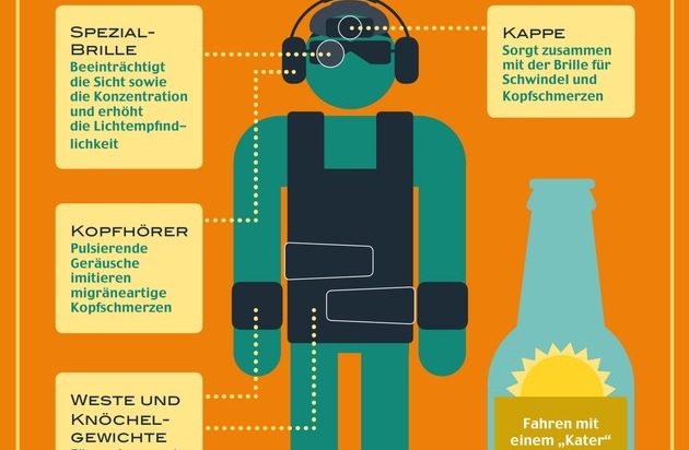 "Es ist schwer zu verhindern, dass diejenigen Personen, die auf einer Feier viel Alkohol getrunken haben, am Morgen danach wieder Auto fahren. Zumal die meisten verkaterten Autofahrer morgens alleine am Steuer sitzen", sagte Jim Graham, Manager, Driving Skills for Life mit Bezug auf eine Studie der Association for Psychological Science***. "Zur besseren Anschauung zeigt unser 'Hangover'-Anzug, wie sehr ein Alkoholkater die Risiken während der Teilnahme am Straßenverkehr erhöht".