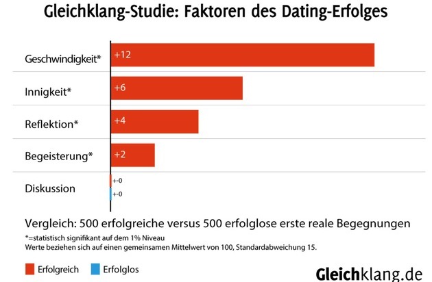 Die psychologische Partnervermittlung www.Gleichklang.de hat die Erfolgsfaktoren untersucht, die dazu führen, dass ein erstes Treffen außerhalb des Internet zu einer Partnerschaft führt. Hierzu wurden 1000 männliche und weibliche Mitglieder im Alter von 21 und 79 Jahren über ihr erstes Date befragt.