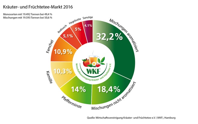 2016 wurden deutschlandweit 16,4 Milliarden Tassen Kräuter- und Früchtetee getrunken. Noch nie haben Kräuter- und Früchtetees einen so hohen Absatz auf dem deutschen Markt gefunden wie im vergangenen Jahr. Der Verbrauch stieg gegenüber dem bisherigen Rekordjahr 2015 von 39.249 auf 39.445 Tonnen an. Im Durchschnitt trinkt jeder Deutsche über das Jahr verteilt 40,4 Liter Kräuter- und Früchtetee, Tendenz steigend.