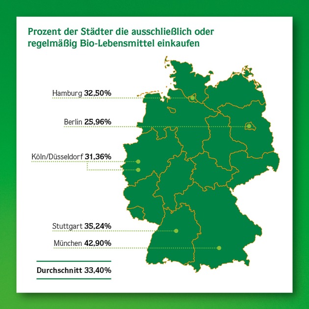 Die Vorlieben und die Kaufgründe der Biokundschaft hat die Umfrage "Wie bio is(s)t Deutschland" im Auftrag der Andechser Molkerei Scheitz GmbH ermittelt. Das Ergebnis: Bio-Lebensmittel haben in deutschen Großstädten ihren festen Platz im Einkaufskorb. Von insgesamt 4.727 Befragten kauft jeder Dritte "ausschließlich" oder "regelmäßig" Bio-Produkte. Dabei kamen 1.028 der Befragten im Alter von 18 bis 69 Jahren aus München, 1.044 aus Berlin, 1.033 aus dem Großraum Düsseldorf/Köln, 1.046 aus Hamburg und 576 aus Stuttgart. Die meisten Bio-Käufer leben in München mit 43 Prozent, gefolgt von den Stuttgartern mit 35 Prozent. In Hamburg kauft jeder Dritte mindestens regelmäßig Bio-Produkte, im Großraum Düsseldorf/Köln greifen 31 Prozent der Befragten zu Bio-Lebensmitteln. Die Berliner haben mit aktuell knapp 26 Prozent Bio-Lebensmittelkäufer das größte Zuwachspotenzial.