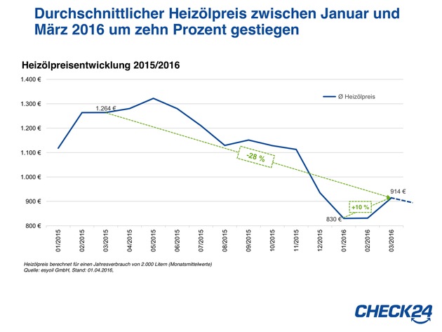 "Verbraucher profitieren auch weiterhin von günstigem Heizöl. Trotz höherer Preise im März ist ein nachhaltiger Preisanstieg durch das weltweite Überangebot nicht in Sicht", sagt Dr. Oliver Bohr, Geschäftsführer Energie beim Vergleichsportal CHECK24.de.