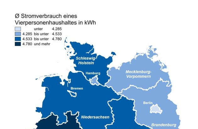 Überdurchschnittlich viel Strom benötigen auch Familien aus Nordrhein-Westfalen, Rheinland-Pfalz, Niedersachsen, Hessen, Schleswig-Holstein und Bayern.1)