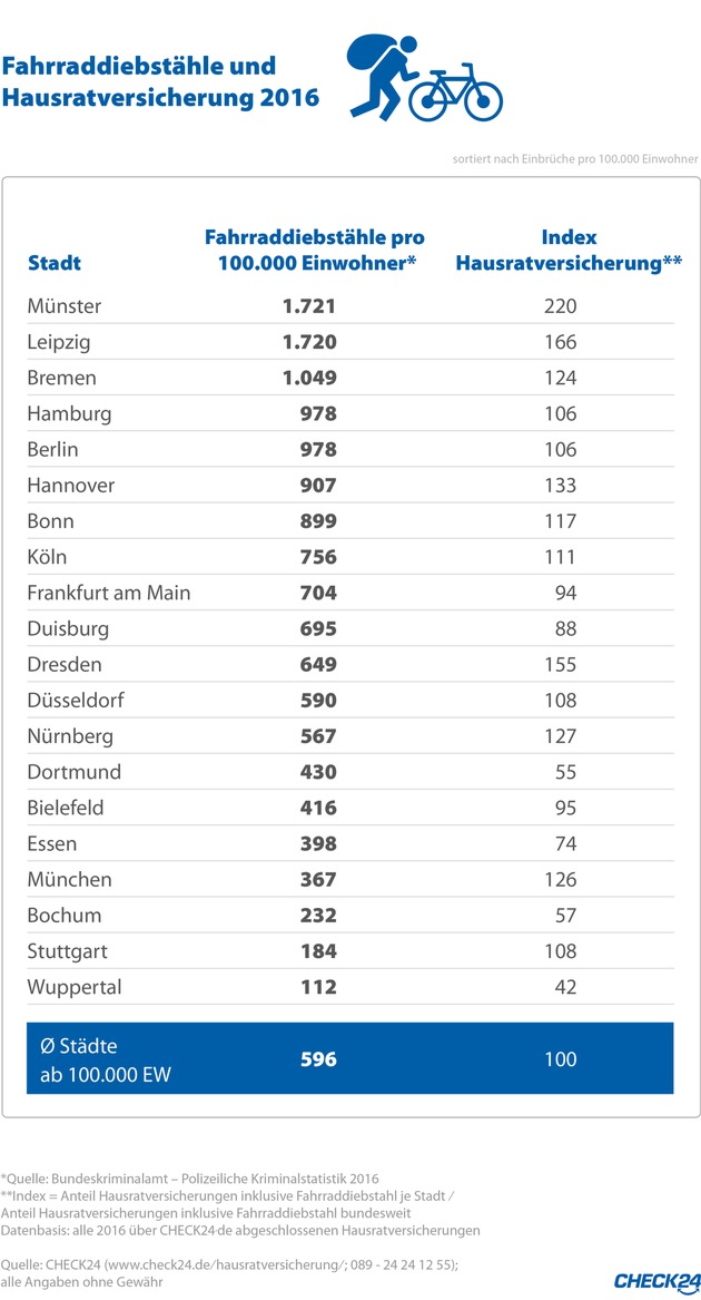 *Quelle: Bundeskriminalamt - Polizeiliche Kriminalstatistik 2016 **Datenbasis: alle 2016 über CHECK24.de abgeschlossenen Hausratversicherungen; weitere Informationen rund um das Thema Fahrraddiebstahl unter https://www.check24.de/hausratversicherung/fahrraddiebstahl/ ***Quelle: http://ots.de/TKlXX (Stand Februar 2017)