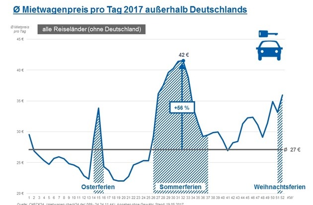 wie im JahresmittelUrlauber zahlen in den Sommerferien 2017 deutlich mehr für ihren Mietwagen als im restlichen Jahr. In beliebten Urlaubsländern kostet ein Leihauto im Sommer durchschnittlich 42 Euro pro Tag - 56 Prozent mehr als im Jahresmittel (Ø 27 Euro pro Tag).*