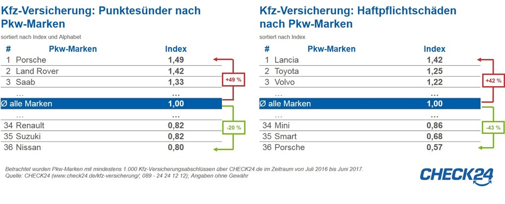 *)Betrachtet wurden Automarken mit mindestens 1.000 Kfz-Versicherungsabschlüssen über CHECK24.de im Zeitraum von Juli 2016 bis Juni 2017. Bei den Angaben zu Eintragungen im Fahreignungsregister des Kraftfahrt-Bundesamtes ("Punkte in Flensburg") und regulierten Kfz-Haftpflichtschäden in den vergangenen drei Jahren handelt es sich um Kundenangaben, die zum Abschluss einer Kfz-Versicherung notwendig sind. Vollständige Tabellen unter http://ots.de/cfGpE