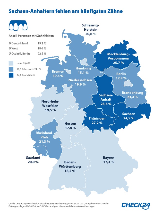 Drittel der Kunden wichtigSachsen-Anhalter haben am häufigsten Lücken im Gebiss. Bei Abschluss einer Zahnzusatzversicherung geben knapp 29 Prozent der Verbraucher aus Sachsen-Anhalt an, Zahnlücken zu haben. In Hamburg fehlen nur 15 Prozent der Versicherungskunden Zähne. Generell ist der Anteil von Personen mit fehlenden Zähnen im Osten Deutschlands (23 Prozent) im Schnitt höher als im Westen (19 Prozent).*