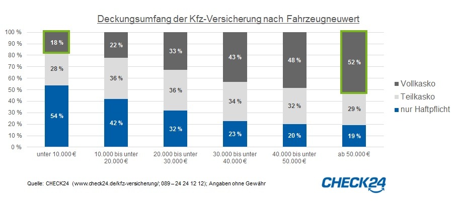 KaskoschutzJe mehr das eigene Auto kostete, desto häufiger wählt der Versicherungsnehmer eine Vollkaskoversicherung. Der Anteil steigt mit dem Fahrzeugneuwert von 18 Prozent (Fahrzeuge bis 10.000 Euro Neuwert) auf 52 Prozent (ab 50.000 Euro).*